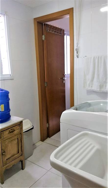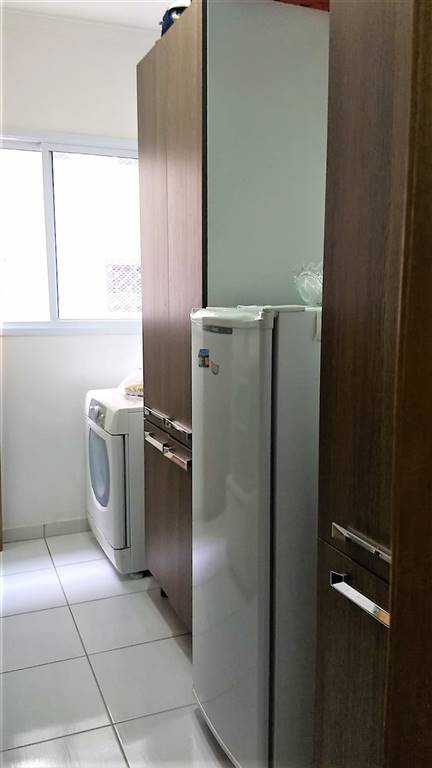 Cozinha com armários planejados, geladeira, forno, fogão, lavanderia com máquina de lavar e secar, quarto e banheiro de serviço.